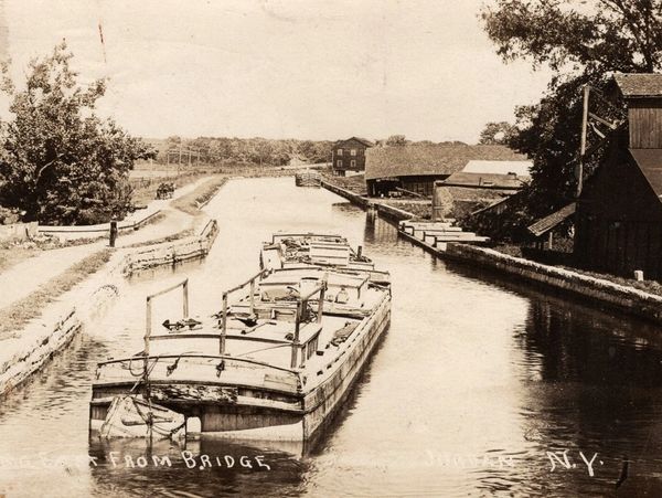 Looking East from Bridge, Jordan N.Y. Postcard 5.5" W x 3.4" H. (Elbridge, New York: Town and Village of Elbridge Offices of Public Historian & Elbridge Historical Archives. 1910-8156-JorV-4b-Erie Canal-NMainBridge.) 1910.